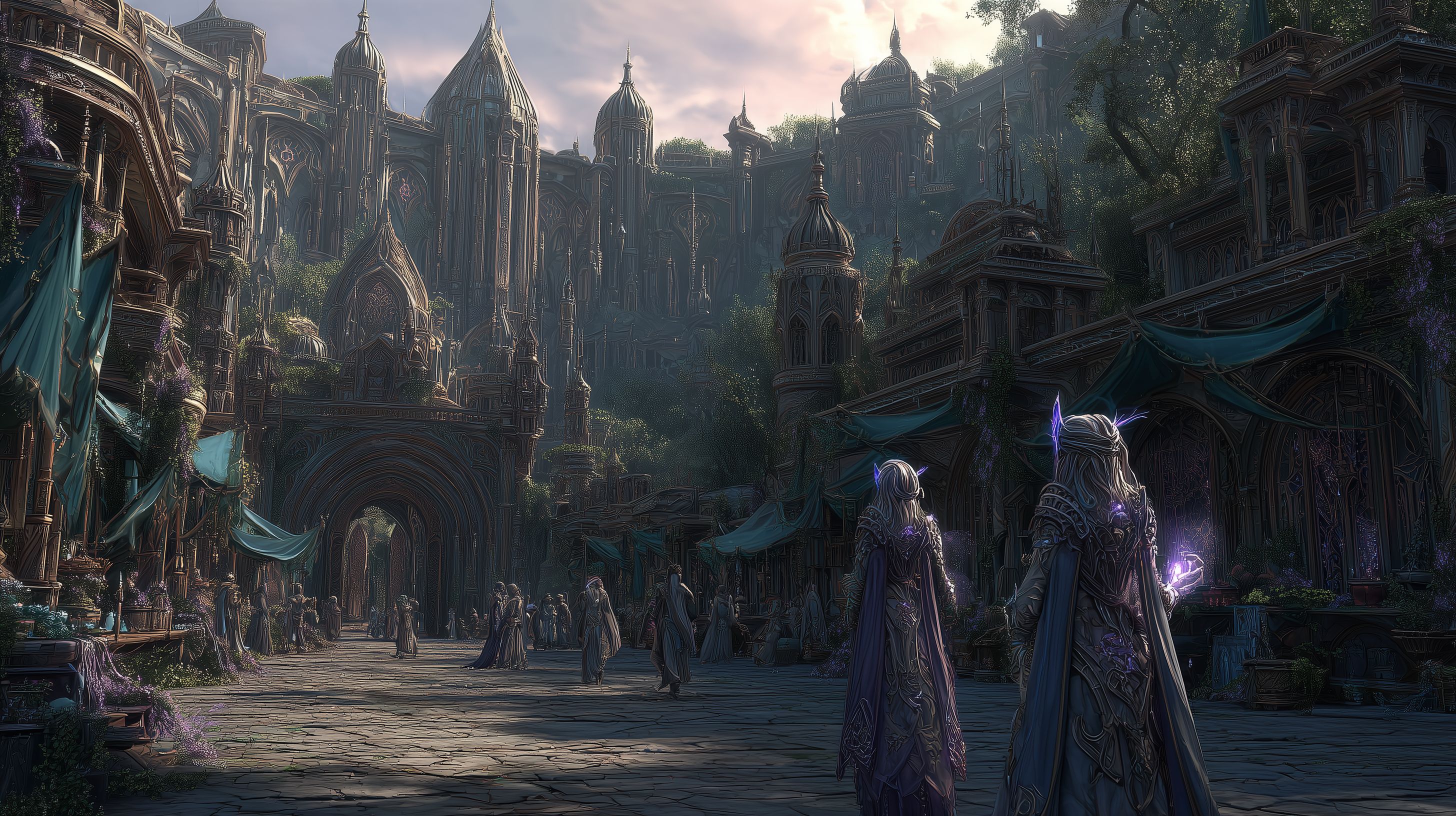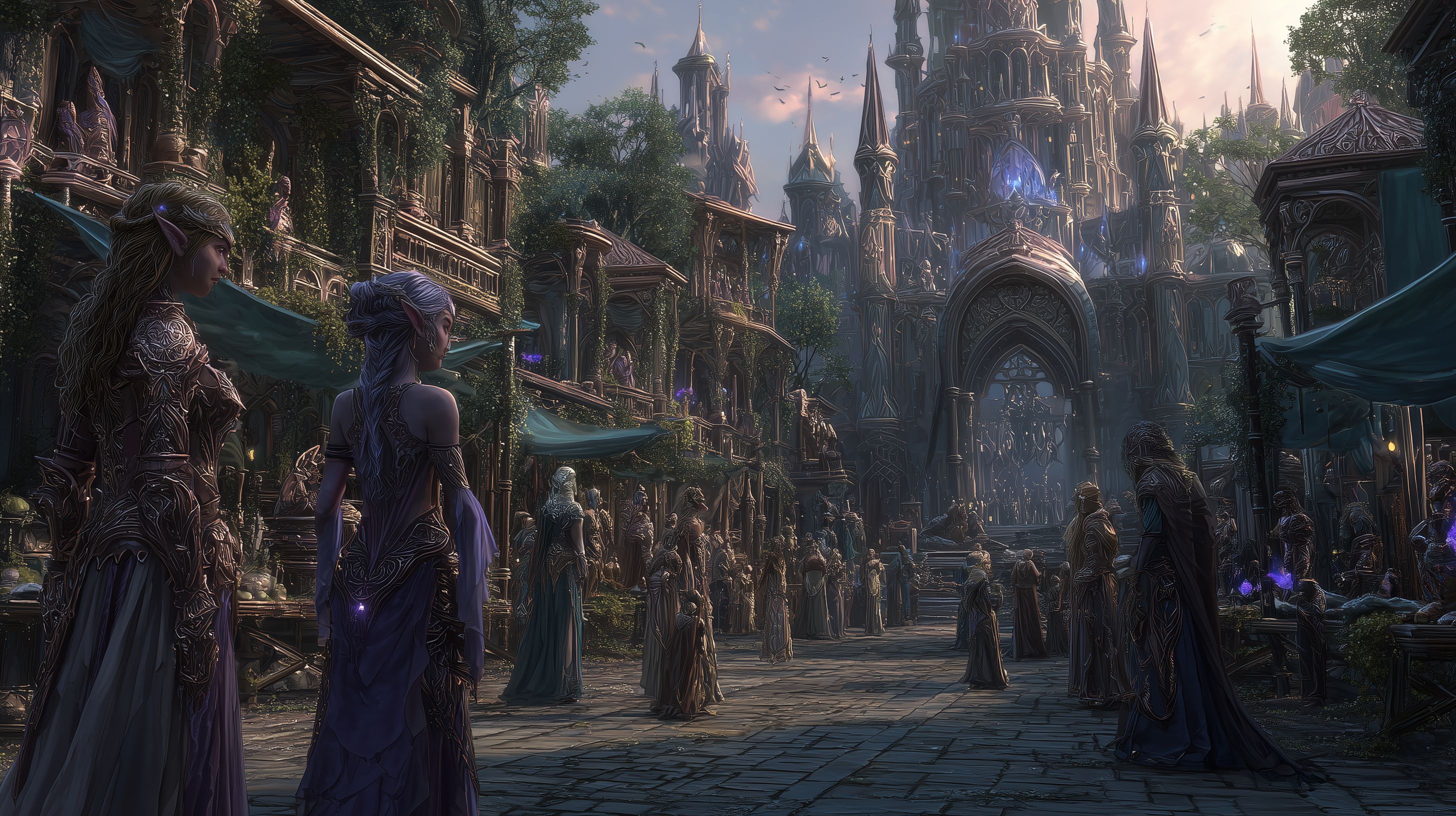 Na placach między magazynami i głównymi alejami rozstawiane są bazary — codzienne, zmienne, często głośne. Znajdziesz tu wszystko od egzotycznych przypraw po proste narzędzia. Elfy, choć znane z dystansu, tu są konkretne i rzeczowe — szybko kupują, sprzedają, targują się z klasą.
