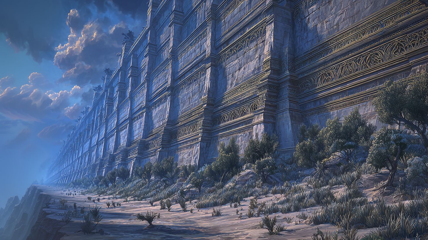 Zewnętrzne mury tego elfickiego bastionu są wyjątkowo monumentalne, skonstruowane z precyzyjnie obrobionych bloków bladego kamienia, który pod wpływem światła przybiera delikatny, srebrzysty odcień. Powierzchnię murów zdobią misterne ornamenty wykonane z mithrilu, układające się w skomplikowane wzory geometryczne oraz motywy roślinne, subtelnie migoczące w słońcu i nadające całości wyrafinowanego splendoru.
