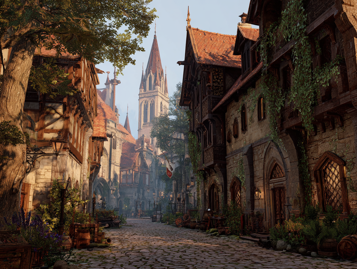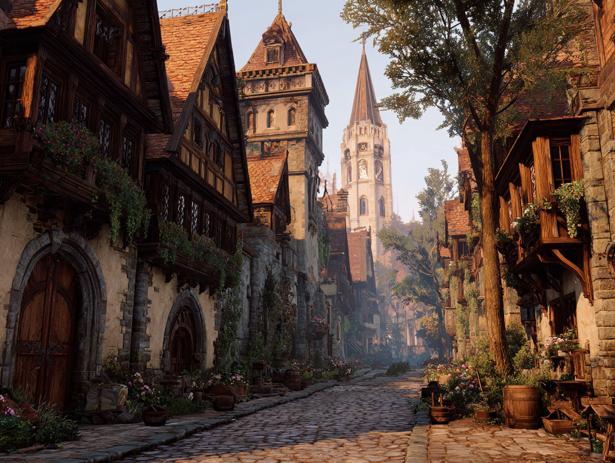 Szerokie, brukowane ulice prowadzą przez wszystkie dzielnice, a uporządkowane rynsztoki, kanały i odpływy zapewniają higienę w niemal całym mieście. Wzdłuż głównych traktów stoją kamienne latarnie, zaś w sercu miasta biegnie prosta, szeroka oś, którą mieszkańcy nazywają Aleją Korony. To nią wędrują triumfy, kary, poselstwa i pogrzeby; to nią miasto pokazuje, że ma pamięć, wolę i dyscyplinę.