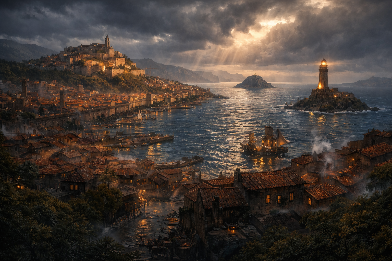Rultrig to stolica księstwa Raweith i główny port północno-zachodniego Amarth, położony na styku gorącej anomalii i naturalnego, umiarkowanego chłodu, w pasie bardziej zalesionym i o klimacie łagodniejszym niż reszta okolicy. Stanowi kluczową bazę wypadową na sporne ziemie Wysp Nesselis, a jego znaczenie podkreśla obecność części floty wojennej Amarth oraz rozległych koszar należących do największych w tej części kontynentu. To miasto duże, zdyscyplinowane i uporządkowane — próżno szukać tu chaosu, ponieważ władze konsekwentnie budują wizerunek Rultrig jako centrum kultury, nauki i siły militarnej północnego Amarth. Wyraźny podział na dzielnice wojskowe, kupieckie i szlachecką nie pozostawia wątpliwości co do jego natury: jest to port, twierdza i stolica w jednym. Nad Zatoką Burz góruje jego najbardziej rozpoznawalny punkt — Wyspa Ols, leżąca niemal na środku wód, w pobliżu której często kotwiczą okręty floty, a sama wyspa stanowi milczący symbol kontroli, bezpieczeństwa i tajemnic, o których w Rultrig mówi się wyłącznie półgłosem.