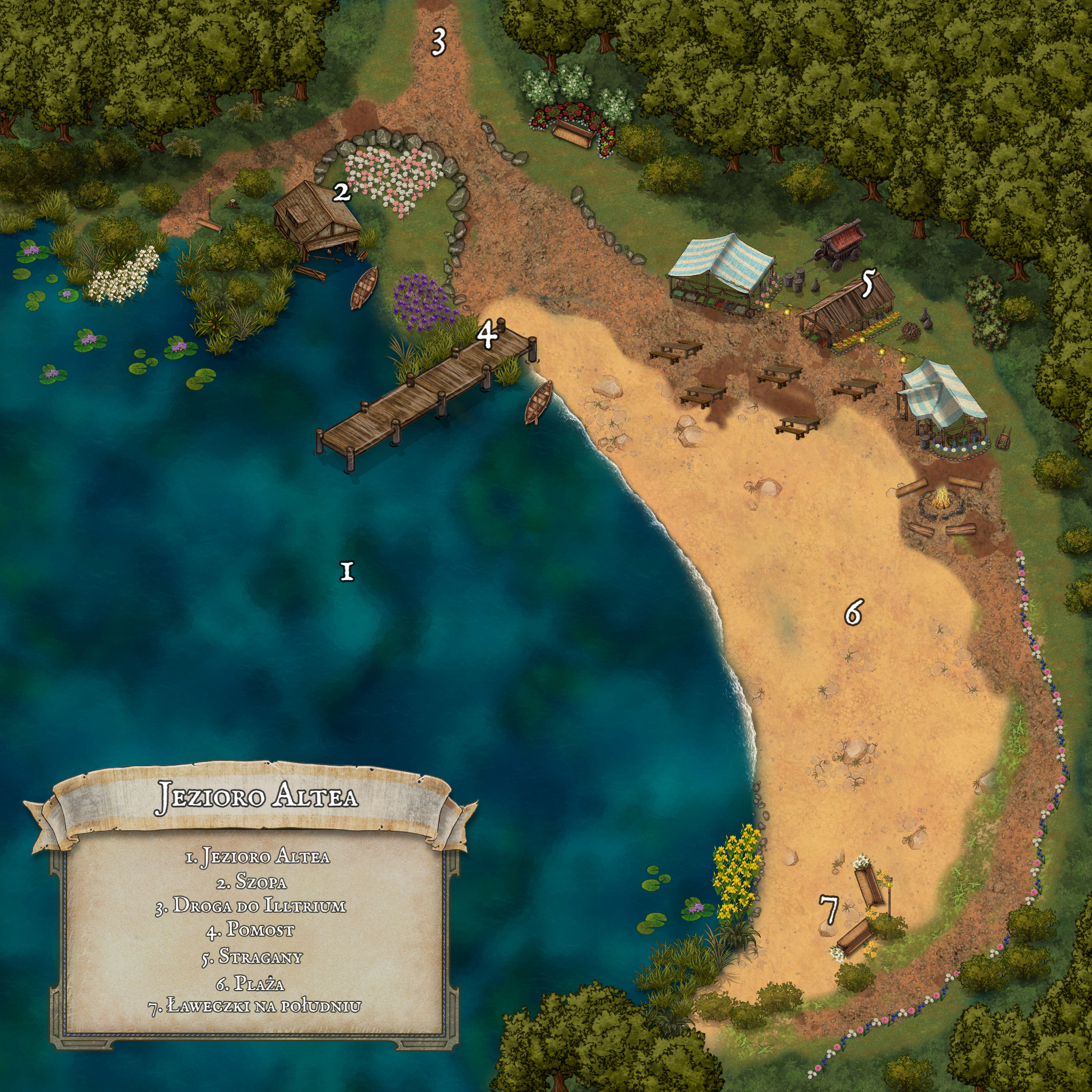 Jezioro Altea znajduje się na zachód od Illtrium, w porastających tę część wyspy lasach. Wystarczy opuścić miasto Zachodnią Bramą, minąć Uzdrowisko i uważać, by nie skręcić za bardzo na południe, bo tam akwen otaczają zdradliwe bagniska. Od północy zaś rozciągają się przyjemne piaszczyste plaże ocienione wysokimi sosnami, a dno łagodnie opada ku głębiom, dając możliwość w miarę bezpiecznego pluskania się przy brzegu. Liczne zatoczki porośnięte trzciną i tatarakiem zapewniają odrobinę prywatności tym, którzy szukają spokoju.
