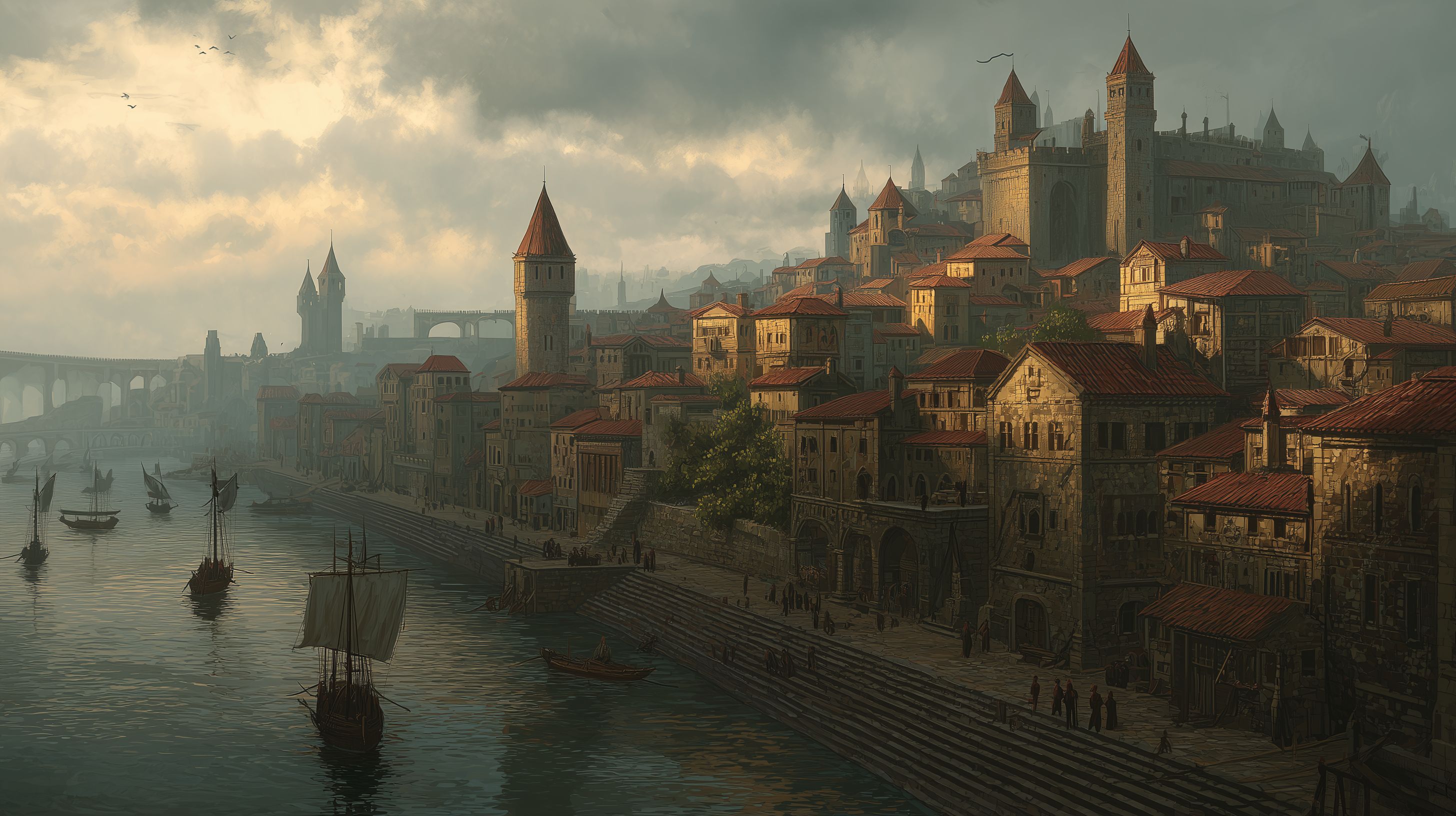 Całe miasto otoczone jest jednolitym pierścieniem zewnętrznych murów, których ciąg urywa się dopiero przy linii brzegowej portu. Tam, zamiast murów, znajdują się dwa bastiony nabrzeżne, które zamykają portową zatokę. Układ dzielnic, główne szlaki i linie podziału tworzą czytelną strukturę. Każda część miasta pełni wyraźnie przypisaną funkcję, a ich rozmieszczenie podporządkowane jest logice transportu, obrony i dostępności.