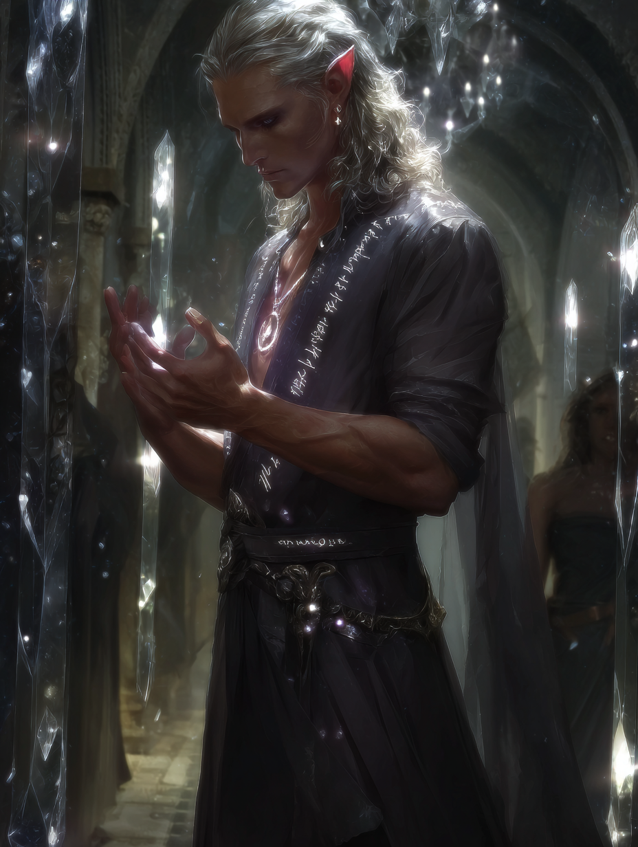 Jego oczy są ciemnosrebrne, bystre i spostrzegawcze, niosące intensywność niezachwianej wiary. Włosy są długie i popielatoszare, luźno związane z tyłu. Strój odzwierciedla jego świętą rolę — ceremonialne szaty w blasku księżyca w srebrze i głębokim indygo, naznaczone świętym Elfim pismem i geometrycznymi wzorami symbolizującymi przeznaczenie i Luminusa.