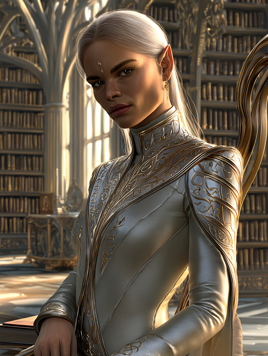 Ma jasną, bladą cerę i długie, proste, prawie białe blond włosy, starannie rozdzielone. Jej oczy są zimne, szare, analityczne i skupione, bez ciepła w wyrazie. Nosi eleganckie, wysokie elfickie szaty w odcieniach kości słoniowej i srebra, haftowane minimalistycznymi symbolami runicznymi.
