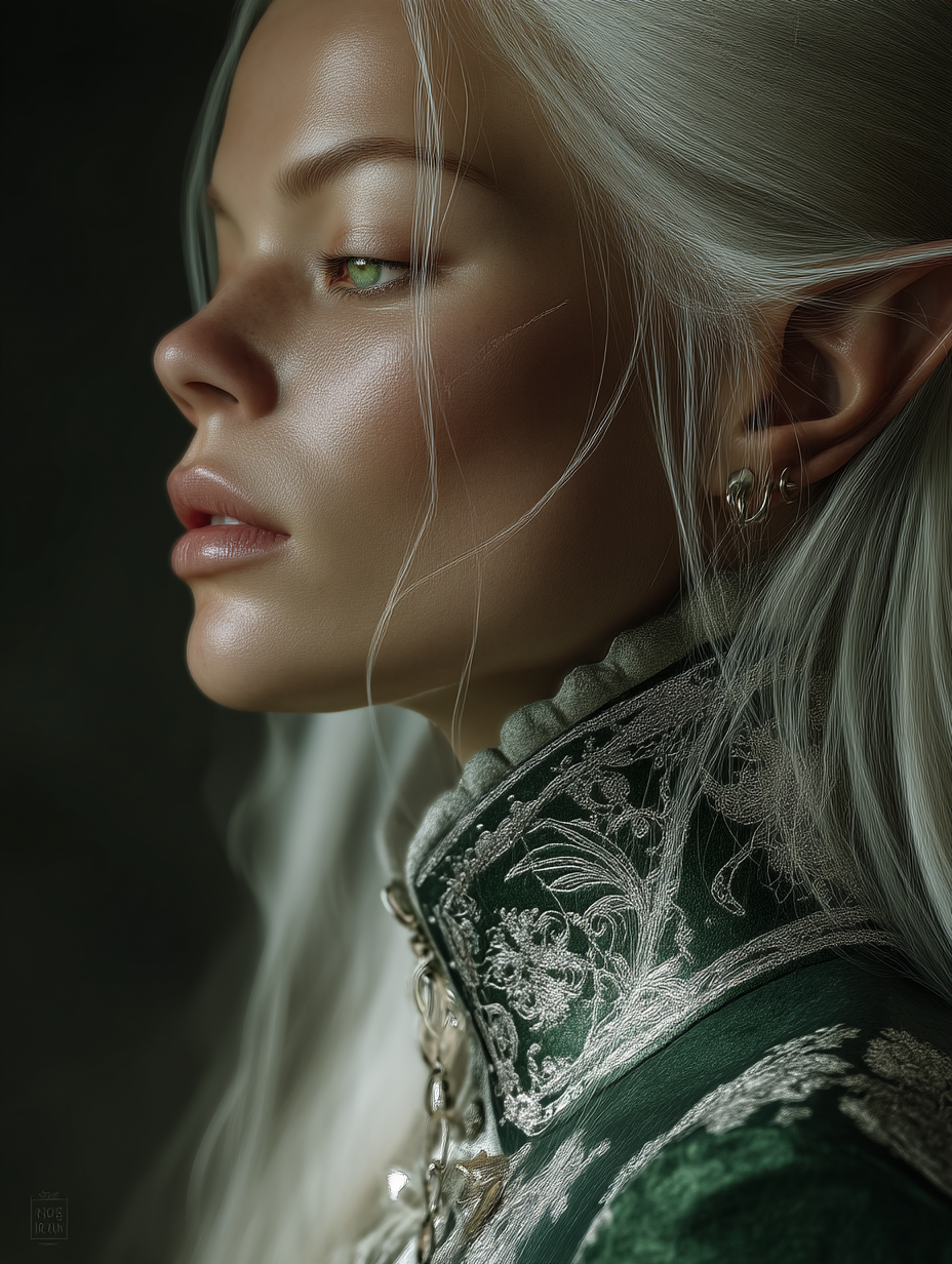 Wysoka Elfka o imponującej prezencji i promiennej postawie, uosabiająca zarówno piękno, jak i siłę, które przez wieki przywództwa uległy wyrafinowaniu. Jej rysy są idealnie wyrzeźbione — ostre, ale harmonijne, a elegancja marmuru wynika raczej z mądrości niż z młodości. Jej oczy, głęboko szafirowe ze srebrnymi plamkami, emanują spokojnym autorytetem. Świecą one delikatnym blaskiem magii i intelektu, odzwierciedlając zarówno empatię, jak i niezachwianą siłę. Jej skóra ma delikatną poświatę księżycowej kości słoniowej, jest gładka, nietknięta upływem czasu, ale naznaczona doświadczeniem.