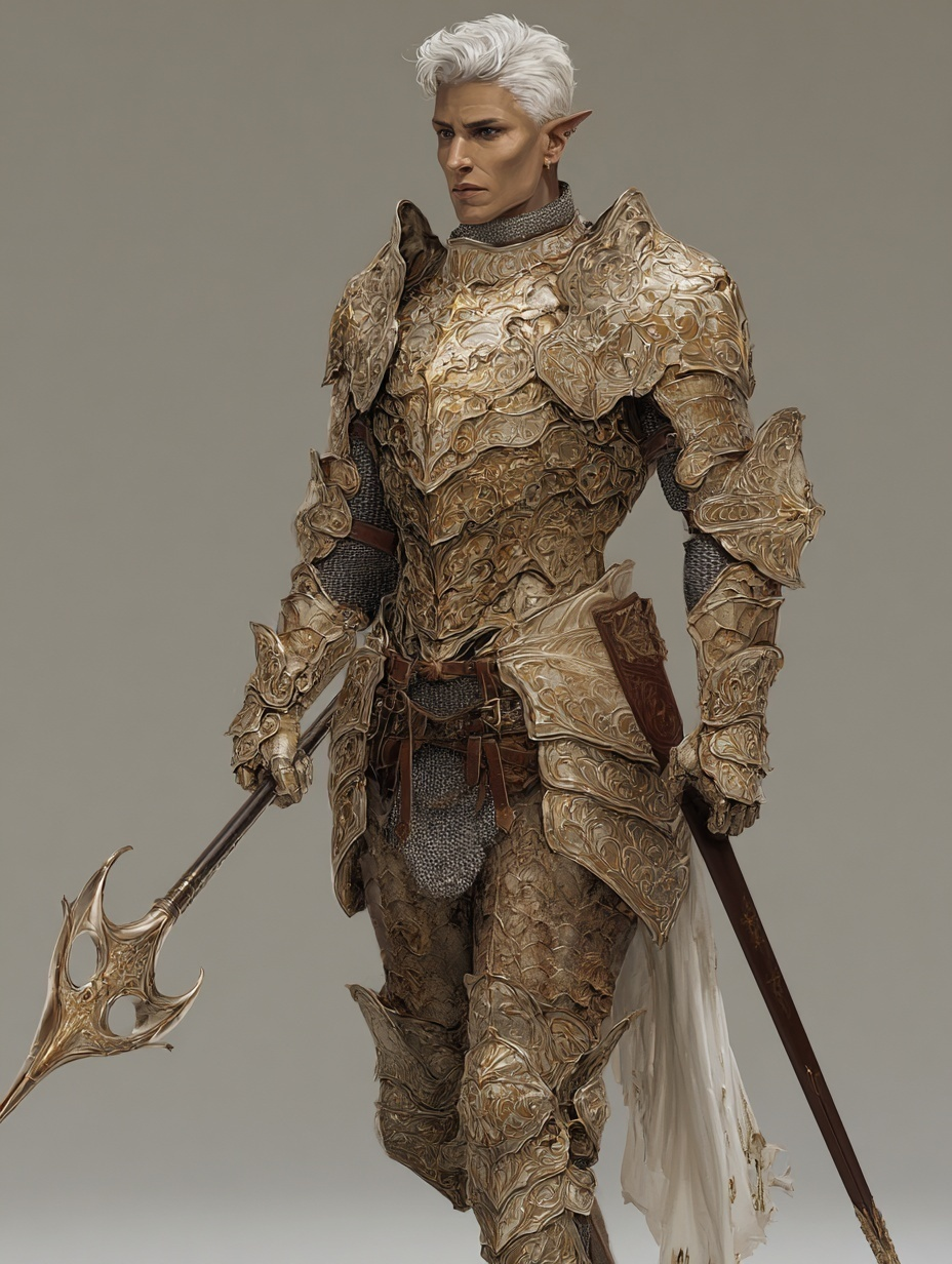 Dojrzały Elf o szlachetnej postawie, wysoki i barczysty jak na swój szczep, o nieskazitelnej i rozważnej postawie. Jego rysy są ostre, a zarazem harmonijne: wysokie kości policzkowe, prosty nos i mocna, wyrafinowana linia żuchwy, świadcząca zarówno o determinacji, jak i intelekcie. Jego oczy są złocisto-bursztynowe, jasne, lecz ciężkie, emanują spokojną powagą dowódcy. Jego usta zaciśnięte są w cichą, nieczytelną linię — nie okrutną, nie łagodną, lecz idealnie opanowaną. Nosi majestatyczną, ciężką elfią zbroję, wykutą z mithrilu ozdobioną złotym ornamentem.