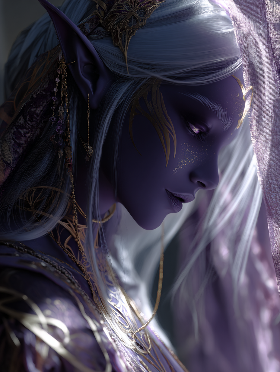 Nikt nie widział dwa razy tej samej Vaeriny — i nie jest to tylko metafora. Elfka ta jest jak lustro odbijające nie tylko nastroje miasta, lecz także jego sny i tęsknoty. Czasem objawia się jako chłodna piękność o włosach białych jak księżycowy pył, z oczami błyszczącymi jak powierzchnia zamarzniętego jeziora; innym razem zjawia się w zmysłowych barwach purpury i złota, z uśmiechem tak ciepłym, że stapia lód w sercach najbardziej opornych.