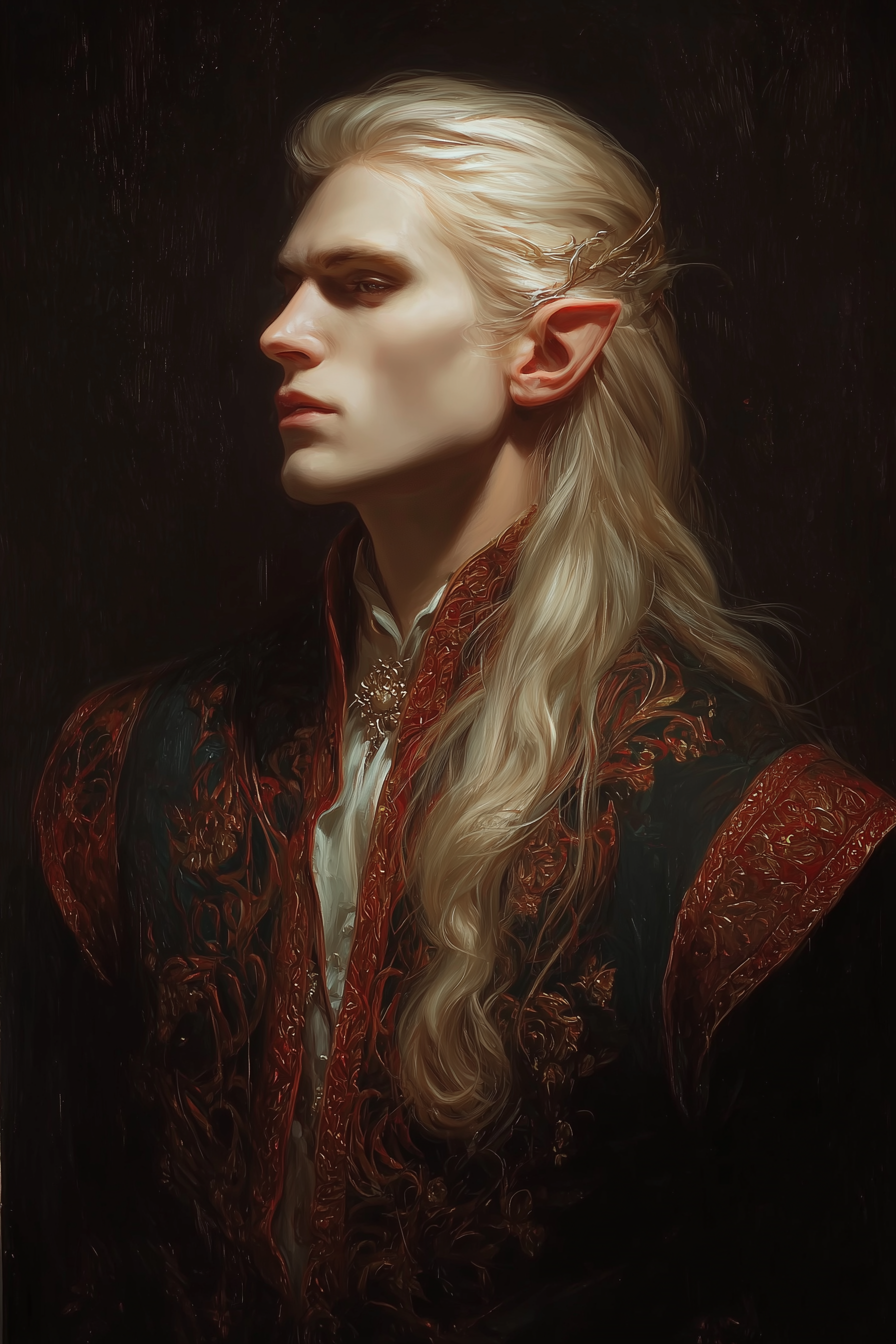 Długie, jasne włosy nosi zwykle rozpuszczone, co najwyżej zebrane z tyłu, by nie zasłaniały mu urodziwej twarzy. Uszy ma krótkie, obłe i zakończone lekkim szpicem, uśmiech ponoć zniewalający — poza najbliższymi osobami jednak mało kto miał okazję go oglądać, zwykle bowiem na jego twarzy goszczą oszczędne grymasy. W odróżnieniu od bladej skóry i jasnych włosów lubi nosić ciuchy w ciemnych i głębokich barwach: czernie, brązy, butelkowe zielenie oraz jego ulubione odcienie borda.