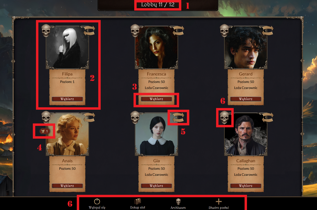 Licznik postaci [1] — w górnej części ekranu widoczny jest pasek informujący o liczbie aktywnych postaci, np. Lobby 11/12 oznacza, że gracz ma 11 postaci z maksymalnie 12 dostępnych. Maksymalnie można posiadać 15 aktywnych postaci.