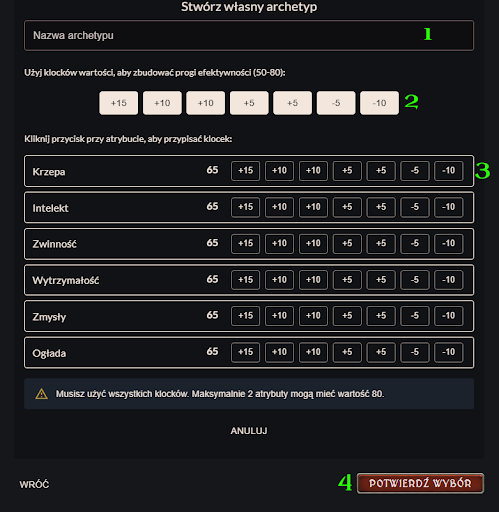 W polu tekstowym (1) wpisujemy nazwę Archetypu. Nazwa ta jest widoczna wyłącznie dla nas — nie pojawia się na karcie postaci.