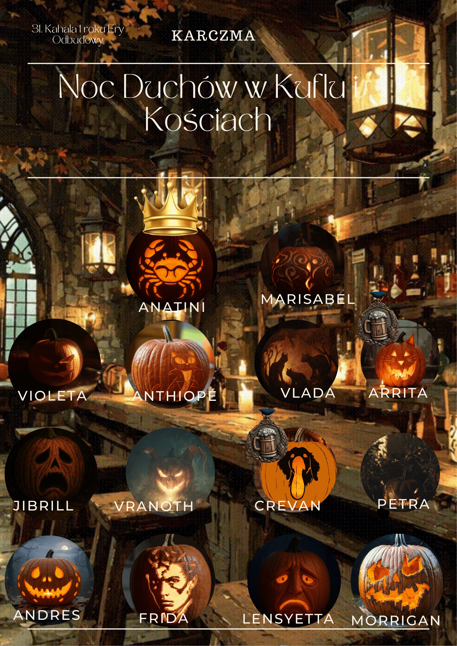 - Crevan: Pojawił się na celebracji Nocy Duchów zorganizowanej w Kuflu i Kościach. Przebrany za Lenny'ego Ebelinga, zrobił furorę swoją immersją, zdolną zmylić przynajmniej na moment nawet gości znających odgrywaną przez niego osobę osobiście. Wziął udział w konkursie rzeźbienia dyni, początkowo wycinając w niej członka, którego ostatecznie przerobił na psa. Jego dynia, wraz z dynią Arrity, zdobyła wyróżnienie dla "ulubionej dyni Kasieńki". Wieczór spędził na rozmowach o odgrywanej przez siebie personie, pomiataniu Anatinim, którego ochrzcił Alojzym Dyndyflakiem i raczeniu się alkoholem.